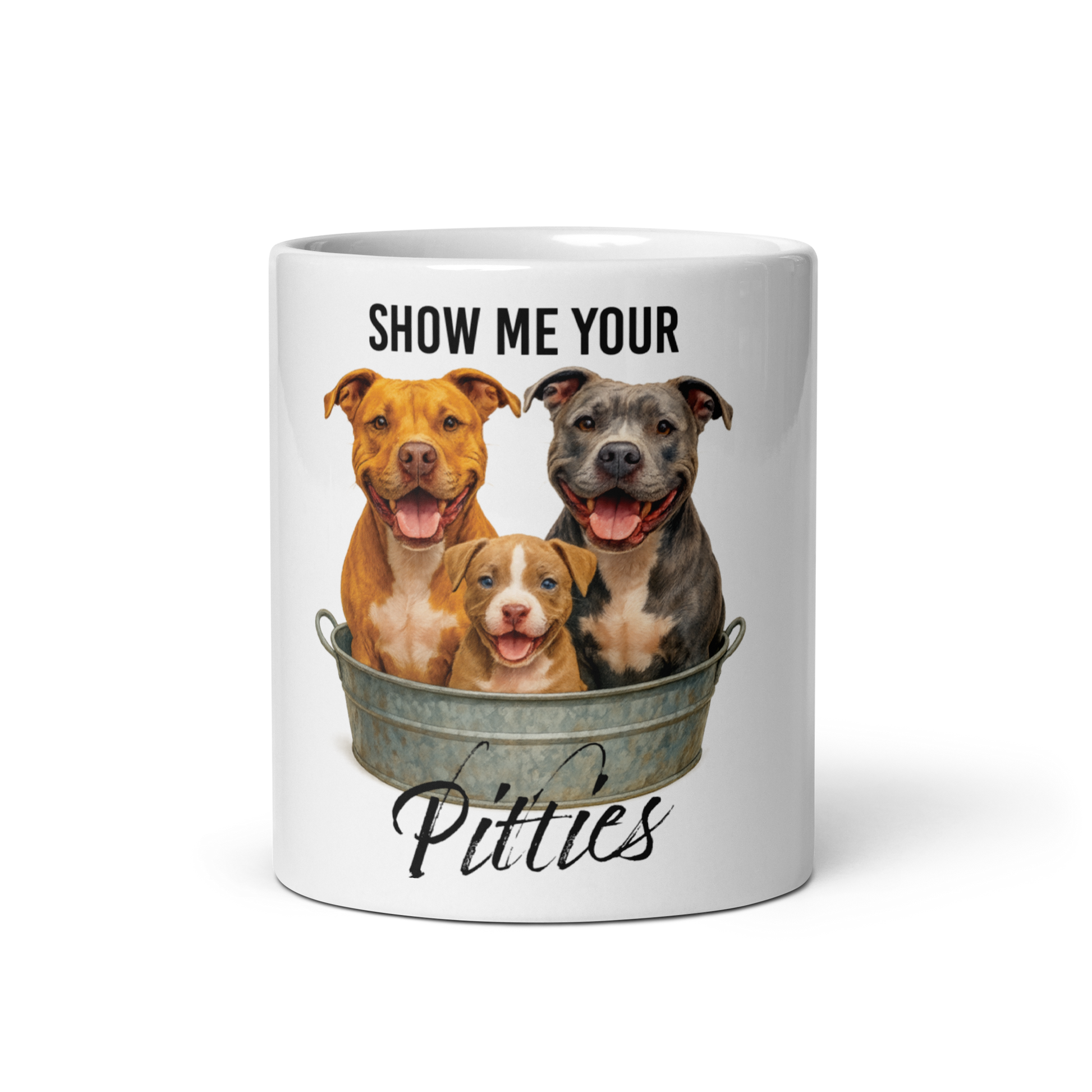 Show Me Your Pitties Mug – Funny Pitbull Lover Gift | 3 Cute Pitties in Washtub | Dog Mom mug | Pitbull Rescue Humor White glossy mug